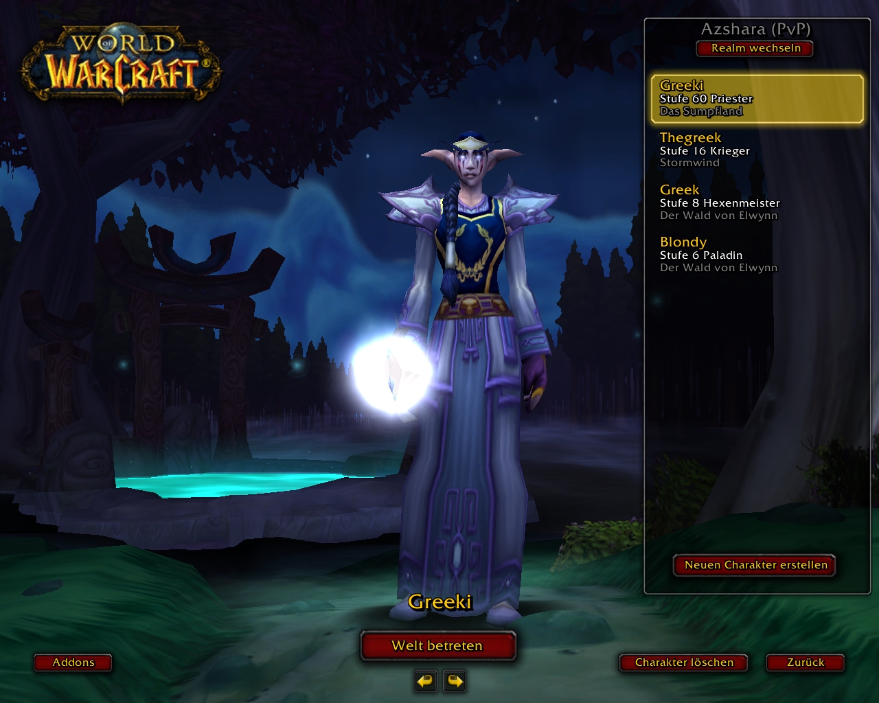 Mein Hauptcharakter bis vor etwa einem Monat war ein Tauren Krieger (PvP Kil'Jaeden, Name: Donsuko), welcher aber aufgrund von mangelnden Heilfähigkeiten durch einen Menschen Paladin (RSP Forscherliga, Name: Donsuko) ersetzt wurde. Dieser spielt sich durch die Heilfähigkeiten um vieles leichter als der Krieger, allerdings finde ich das Anlocken der Gegner ohne Fernkampfwaffen teils ziemlich schwierig.