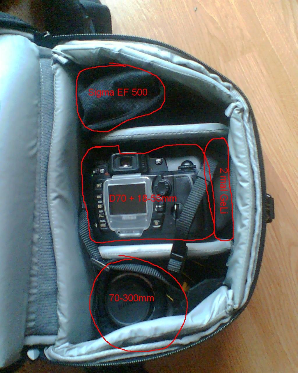 Es hat alles noch leicht Platz, und es ist kein Problem noch 2 Objektive dazu zugeben (Tele und 2 kleine Weitwinkel würd sich auch noch ausgehen).