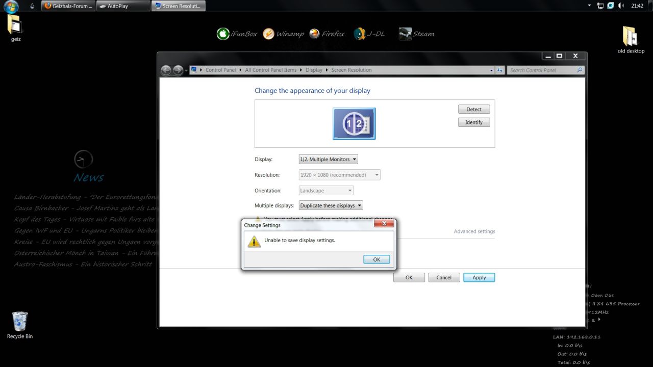 Wenn ich über rechte Maustaste->Screen Resolution gehe scheinen beide Bildschirme auf, aber die Einstellungen sind beim LG ausgegraut und sobald ich auf duplicate gehe kommt die Meldung